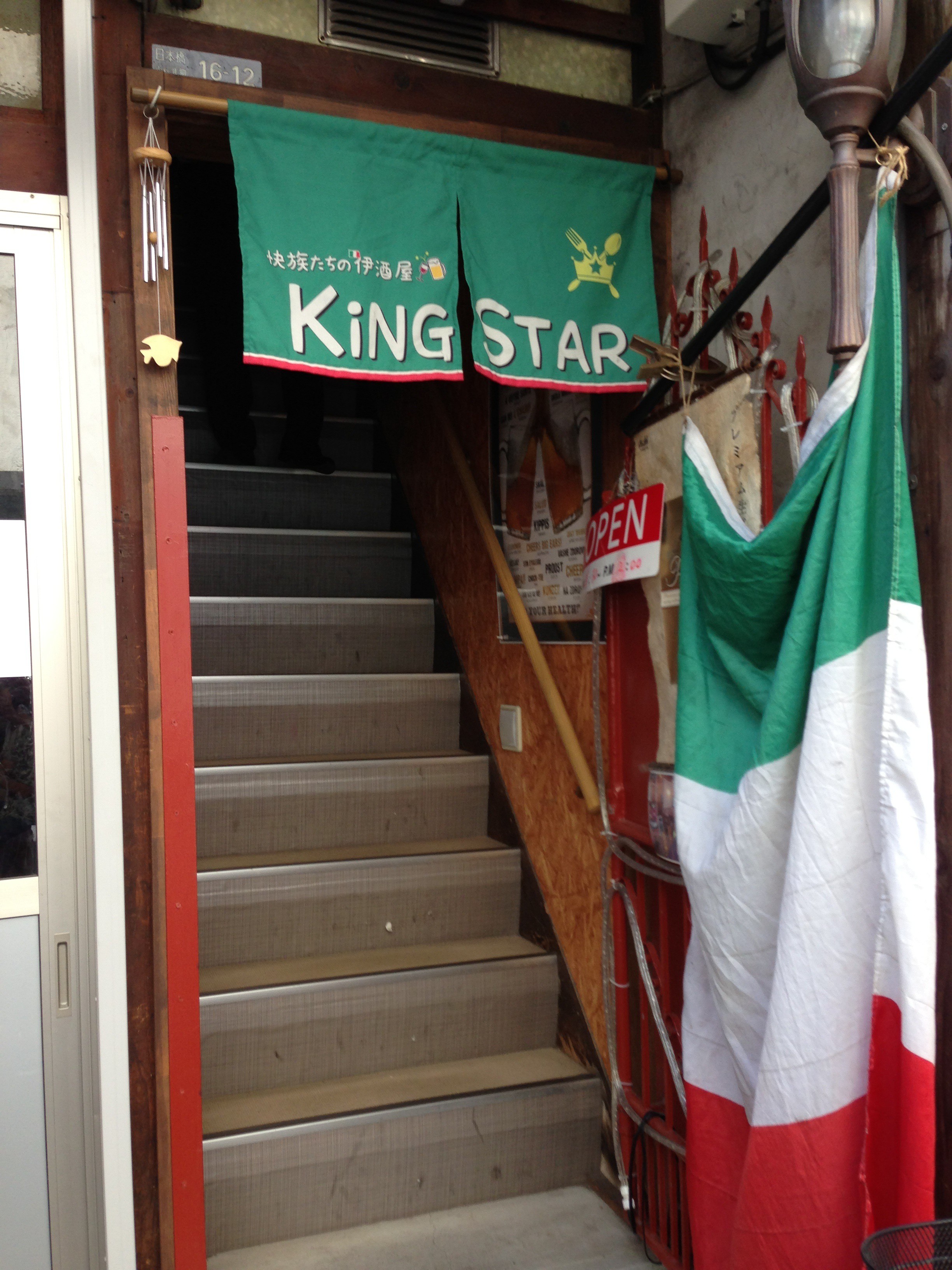 馬喰町交差点から、江戸通りを日本橋方向へ2ブロック、ファミリーマートの角を右に曲がると、左手に何軒かの飲食店が軒を連ねています。跳馬ラーメンの脇、海賊船の旗のようなビールの写真と、入口上部に掲げられた、「快族たちの伊酒屋 KiNG STAR」と書かれた緑の看板が目印です。